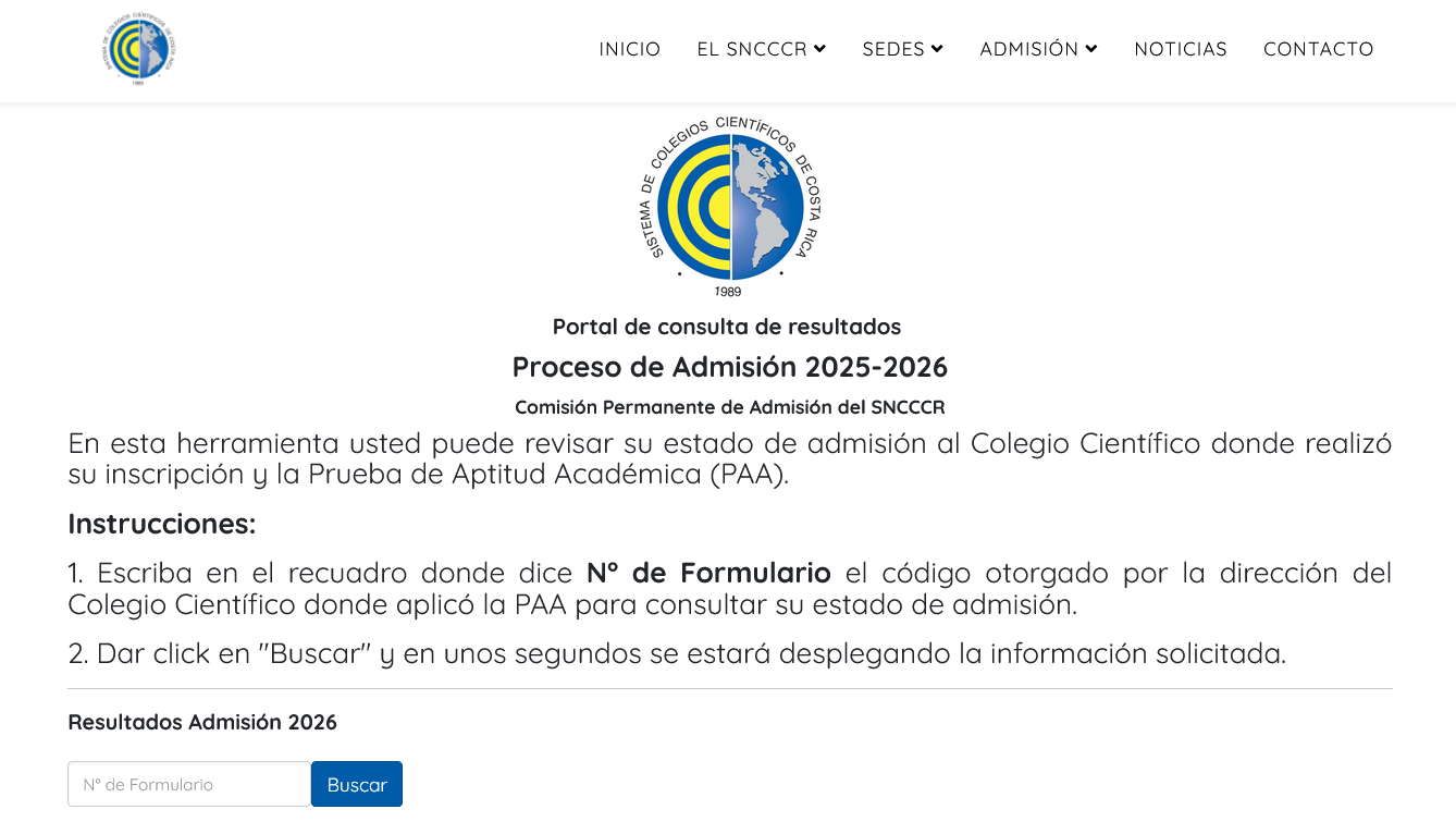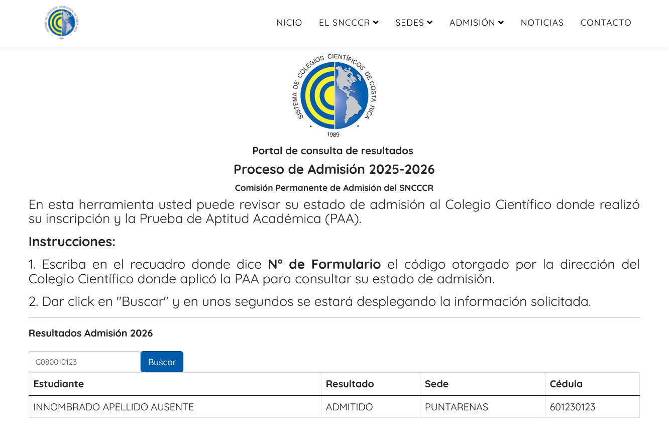 El código para la búsqueda se compone de tres numerales: El código debe ingresarse de esta manera: Siendo que C08 es el código que le corresponde al Colegio Científico Costarricense Puntarenas, 029 el formulario de admisión con dicho numeral y 0123 los últimos 4 dígitos de la TIM o el DIMEX del estudiante que aplicó la Prueba de Aptitud Académica. Ingrese dicho código en el cuadro de búsqueda para revisar el estado de ingreso de su persona. ¡IMPORTANTE!: El resultado final del proceso de admisión es INAPELABLE e INTRANSFERIBLE entre las diferentes sedes del SNCCCR. En caso de resultar admitido, ingresaría unicamente en la sede donde realizó el Proceso de Admisión 2025-2026. Existen tres condiciones posibles: ADMITIDO: Ingresa directamente a la sede donde realizó el Proceso de Admisión 2025-2026. NO ADMITIDO: En donde no logro ingresar a la sede donde realizó el Proceso de Admisión 2025-2026. EN LISTA DE ESPERA: Donde queda en espera que un espacio se libere de los ya admitidos. No todas las sede tienen lista de espera. Esta es una decisión de la administración de cada sede y el manejo de la admisión a las mismas. En caso de no aparecer su nombre o existir un error con el código, favor comunicarse a la dirección del Colegio Científico donde realizó el proceso de admisión. El directorio de contactos se encuentra aquí: Esta herramienta estará disponible para consulta hasta el 10 de Diciembre del 2025.